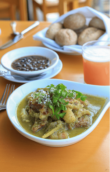 Chicharrón de cerdo grueso, en salsa verde con nopales y papas. Servido con frijoles de la olla y tortillas.